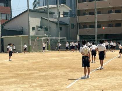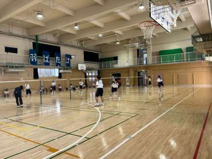 男子はハンドボール投げ、女子はバトミントンに取り組んでいます。