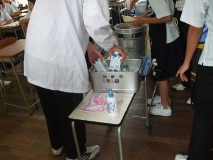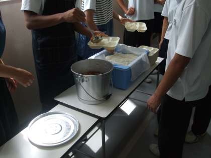 8月28日(火)より、大成小学校で調理した給食を中学校に運び、自分たちで配膳して食べる親子方式の給食が始まりました。大成小学校の皆さんに感謝です。