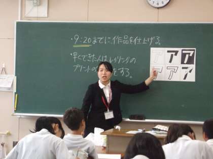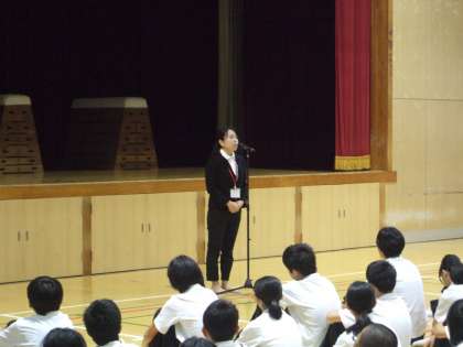 9月3日(月)から教育実習に来ていた高山菜菜先生が、25日(火)に教育実習の最終日を迎えました。全校集会でのあいさつ、そして研究授業をおこないました。