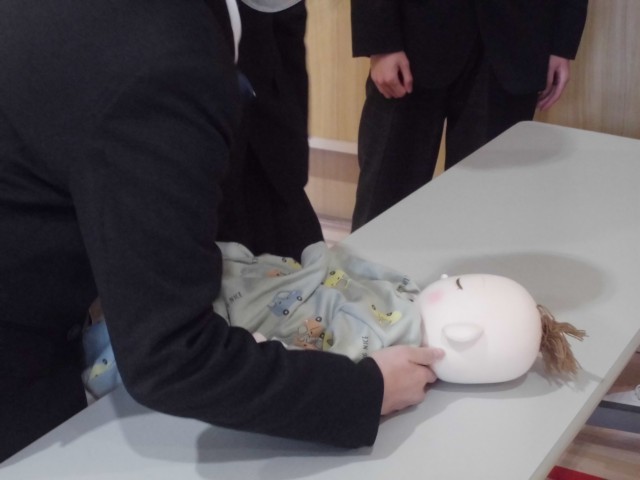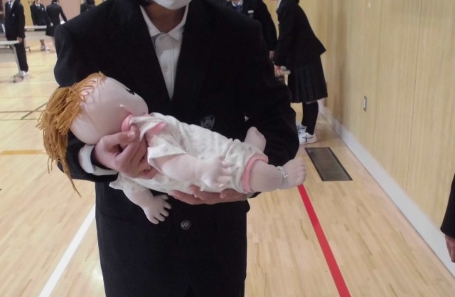 教員から説明を受け、人形を使って抱っこやおむつ交換の体験に取り組みました。