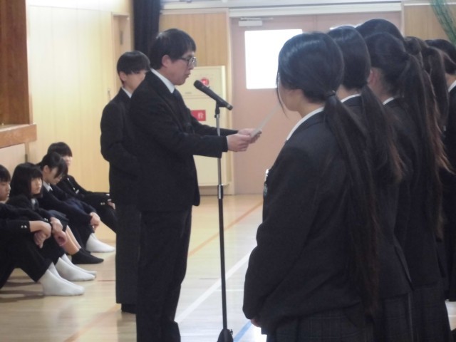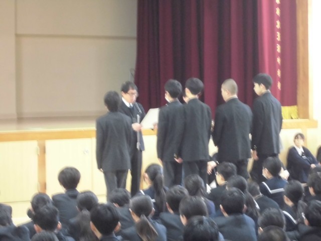 全校集会にてバレーボール部と剣道部の表彰を行いました。