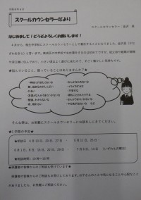 スクールカウンセラーだより (4月13日発行)はじめまして!どうぞよろしくお願いします! 4月から、相生中学校にスクールカウンセラーとして着任することになりました、金沢 晃(かなざわ あきら)と言いま...