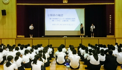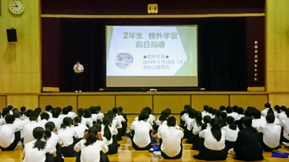 本日の1時間目、2年生は校外学習の事前指導を行いました。明日の校外学習では、班ごとに事前に立てた計画に従って、奈良公園周辺のフィールドワークを行います。