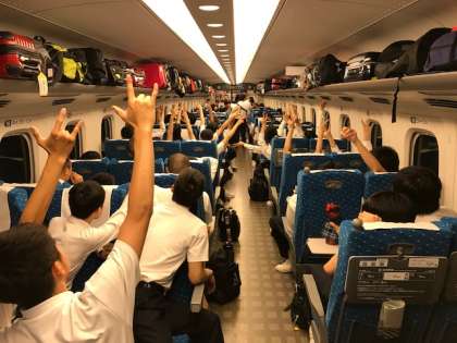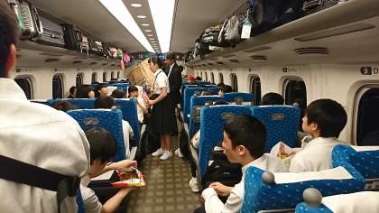 車内の様子です。写真を撮り合ったり、トランプをしたり、お菓子を食べながら談笑したり、和気あいあいと過ごしています。