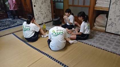 同じく、民泊先での体験です。お茶摘みをした後、部屋でくつろいでいます。