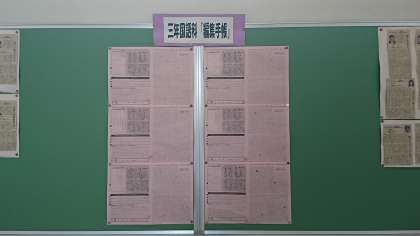 3年生の教室へ上がる階段の踊り場に掲示されています。読売新聞の朝刊に掲載されているコラムの「編集手帳」を書き写すとともに、わからない言葉を調べたり感想などを書くことによって、語彙力や読解力、文章力などを身につけさせる取組です。