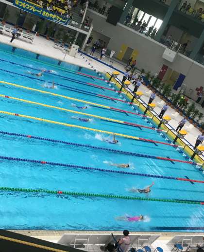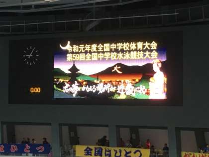 昨日、全国中学校水泳競技大会が京都アクアリーナにて開催され、相生中学校からは1年生の女子生徒が100m背泳ぎの種目で出場しました。残念ながら決勝レース進出はなりませんでしたが、全国の高いレベルの中、1年生ながらよく頑張りました。まだ1年生です。この経験を活かして、今後大いに飛躍してほしいと思います。本当にお疲れ様でした。