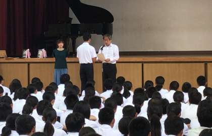 同じく全校集会の中で、昨日開催されました「ジュニアオリンピック陸上挑戦記録会」において優秀な成績を収め、10月11日から13日にかけて神奈川県等々力陸上競技場にて開催される「第50回ジュニアオリンピック陸上競技大会」のリレーメンバーに選ばれた2年生の男子生徒の表彰を行いました。おめでとうございます。よく頑張りました!ジュニアオリンピックでの活躍を祈っております。