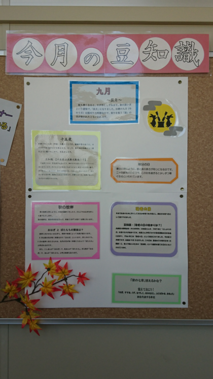 写真は、図書室前の掲示板です。図書館補助員の方が作成された「今月の豆知識」が掲示されています。読書には思考力や想像力、語彙力が向上するなどの効果があります。皆さん、図書室を利用して本に親しみましょう!