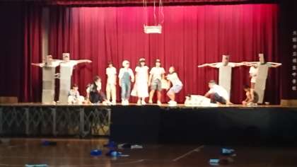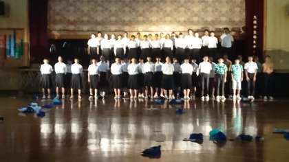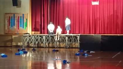 2年生の劇練習の様子です。次の言葉は、パナソニックを一代で築いた松下幸之助さんの言葉です。『何をなすべきかの目標を持ち、使命感を持って、みんなが一致団結するところに成果がある。』