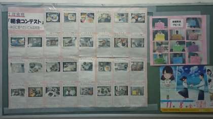 1年生の食育の取組です。「朝食コンテスト〜休日に食べたいこんな朝食〜」や「保健委員アピール」が北館階段踊り場に掲示されています。栄養バランスなど様々な工夫を凝らした素晴らしいメニューばかりでした。保健委員のアピールを一部紹介します。