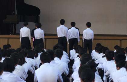 同じく全校集会の中で、大阪市U−13の選抜選手に選ばれた男女バスケットボール部の生徒たちの表彰を行いました。おめでとうございます。ますますの活躍を期待しています!