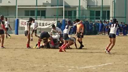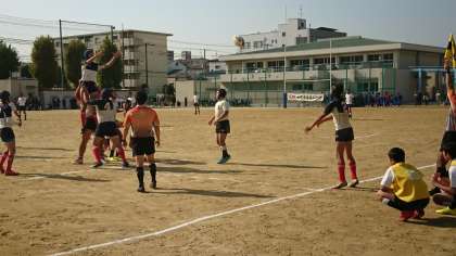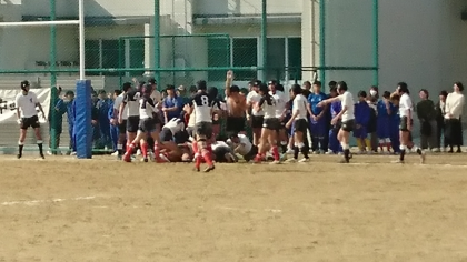 試合は、決勝戦にふさわしい白熱した展開となりました。前半は、菫中学校に1トライを先取されるものの、その後3トライ3ゴールを次々に挙げ、21−5で前半を終えました。