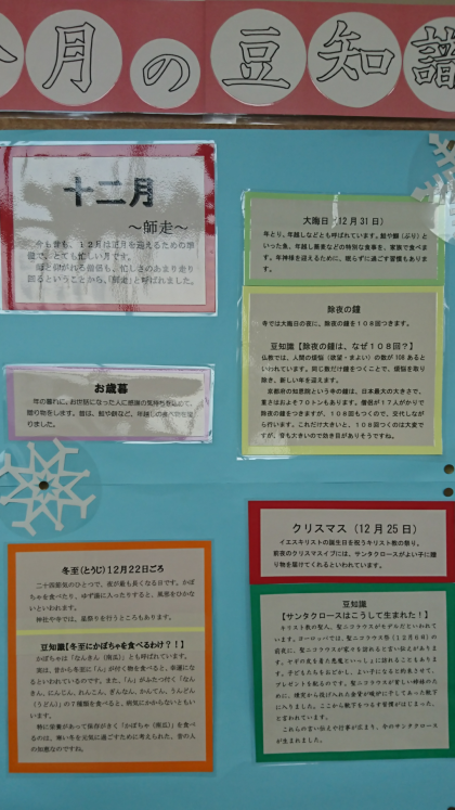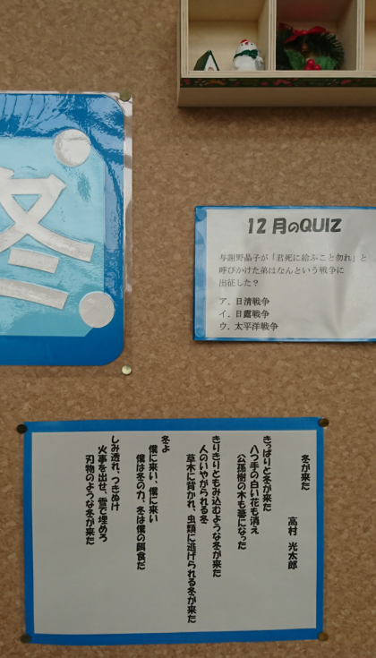 図書室前の掲示板です。図書館補助員の方が工夫を凝らして作成された「今月の豆知識」などが掲示されています。