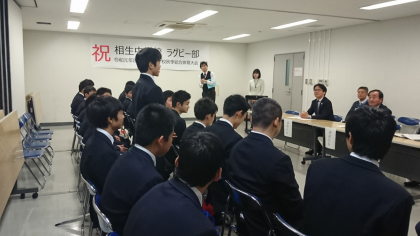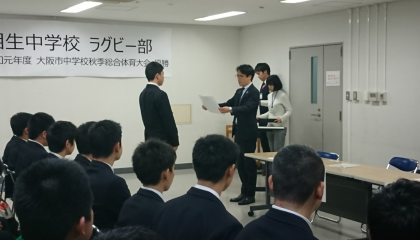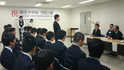 本日、「大阪市中学校秋季総合体育大会」で優勝したラグビー部が、麻野東成区長様から表彰状を授与されました。ラグビー部の皆さん、おめでとうございます。今後の更なる活躍を期待しています。