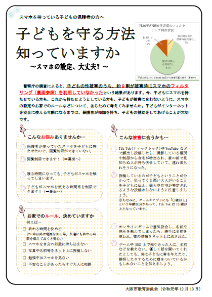 「子どもを守る方法知っていますか〜スマホの設定、大丈夫?〜」というプリントを配布しております。ご一読いただき、子どもたちが被害に合わないように、スマホ(フィルタリング)の設定やお家でのルールなどについて、ご確認いただきますようお願い申しあげます。