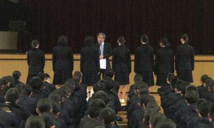 本日の全校集会の中で、12月28日に開催されました「大阪府アンサンブルコンテスト」において、金賞を受賞されるとともに、「関西大会」への出場を果たした吹奏楽部の生徒たちの表彰を行いました。おめでとうございます。本当によく頑張りました!関西大会でのご活躍を心から祈っております。応援よろしくお願いいたします。