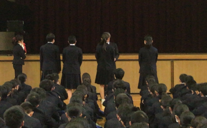 同じく全校集会の中で、「淡路 Challenge cup 2019」において優勝を果たすとともに、同大会ならびに「KOUBUN CUP2019バスケットボール選手権大会」において優秀選手に選ばれた女子バスケットボール部の生徒たちの表彰を行いました。おめでとうございます。本当によく頑張りました!