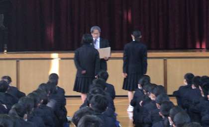 本日の全校集会の中で、12月25日に開催されました大阪府学校給食会主催の「朝食フォトコンテスト」において、入賞された1年生2名の表彰を行いました。おめでとうございます。本当によく頑張りました!