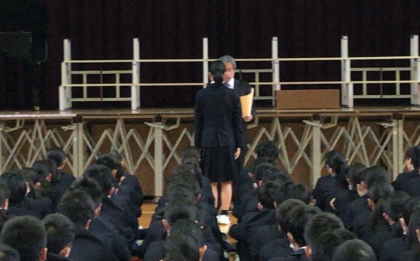 本日の全校集会の中で、昨日行われた「第11回都道府県対抗トランポリン競技選手権大会個人競技15ー16歳女子の部」において、優勝を果たされた3年生の生徒の表彰を行いました。おめでとうございます。本当によく頑張りました!