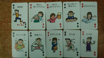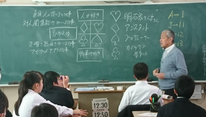 本日、1年生は進路学習の一環として、ヒューマンキャンパス高等学校の川島先生を講師としてお招きし、学級ごとに「SPトランプセミナー」を行いました。「SPトランプセミナー」とは、よく見られる性格が描かれた52枚のカードから自分のSP(サブパーソナリティー)に合った10枚を選び、その組み合わせにより、自分がどんな職業に向いているかを考える取組です。生徒たちには、将来の進路を考える一つのきっかけにしてほしいと思います。