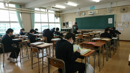 本日、1・2年生の学年末テストの返却を行いました。久しぶりに皆さんの元気な姿を見ることができて、とても良かったです。また、テストの結果はどうだったでしょうか。間違ったところは、しっかりと見直しをしましょう。