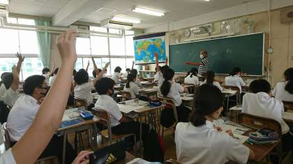本日の授業です。上の写真から1年2組社会、2年2組英語、3年1・2組男子保健体育の授業の様子です。1年生の授業では、たくさんの生徒が挙手をしていました。自分の意見や考えを発表することは、とても大切なことです。ぜひ続けてほしいと思います。
