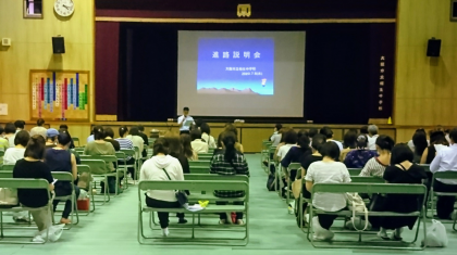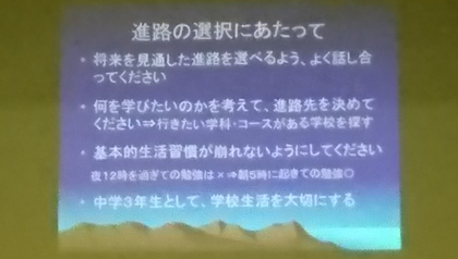 本日、進路保護者説明会を開催いたしました。保護者の皆様には、ご多用の中ご出席いただき、誠にありがとうございました。3年生の皆さんにとっては、いよいよ進路を考える時期となりました。保護者の方や担任の先生と十分に話し合って、悔いのない進路を選択してください。