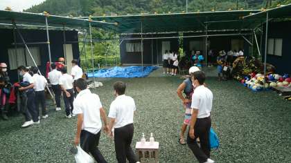 ラフティング会場に到着しました。これからウェットスーツに着替えてラフティングを行います。