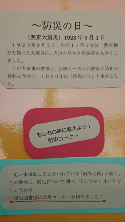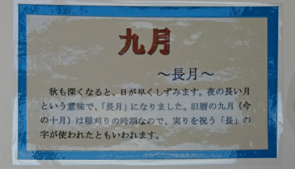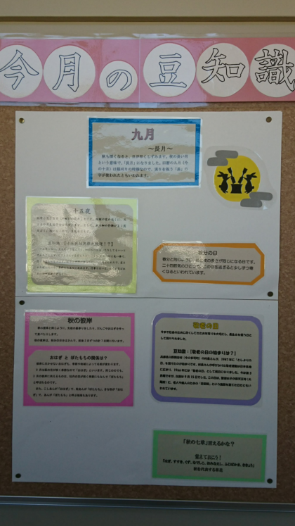 図書室前の掲示板です。図書館補助員の方が工夫を凝らして作成された「今月の豆知識」が掲示されています。まだまだ残暑が厳しいですが、暦の上ではもう秋です。読書の秋、読書に親しみましょう。