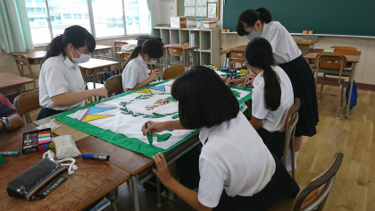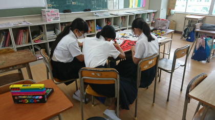 体育大会に向けての学級旗作成が始まっています。放課後に残って頑張って取り組んでいました。どんな旗ができ上がるのか、完成が本当に楽しみです。