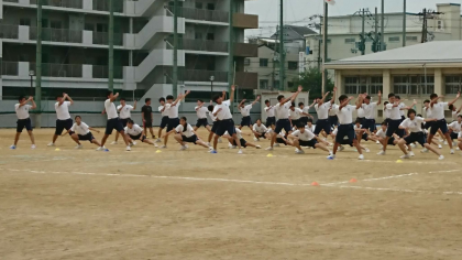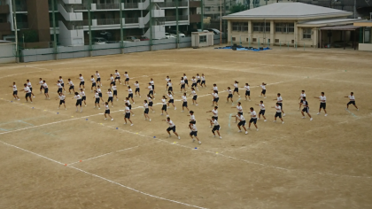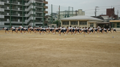 体育大会に向けて、体育の授業でソーラン節の練習を行っています。写真は、本日の練習風景です。早いもので来週が本番です。一致団結して頑張ってください。