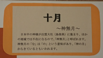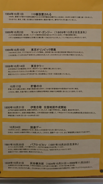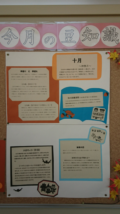 図書室前の掲示板です。図書館補助員の方が工夫を凝らして作成された「今月の豆知識」が掲示されています。10月27日〜11月9日は読書週間です。読書に親しみましょう。
