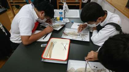 今週の2年生の理科の授業では、「無脊椎動物」についての学習(実験)です。この実験は、脊椎動物であるヒトと無脊椎動物であるイカとの共通点や相違点に気づかせることを目的としています。