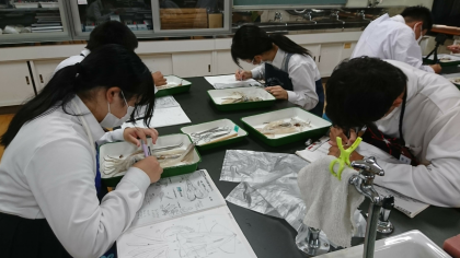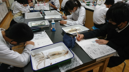 授業担当の先生がスーパーで買ってきたスルメイカを使って、一人一杯ずつ解剖を行いました。生徒たちは興味深く解剖に取り組み、じっくりと体の内部を観察しスケッチしていました。