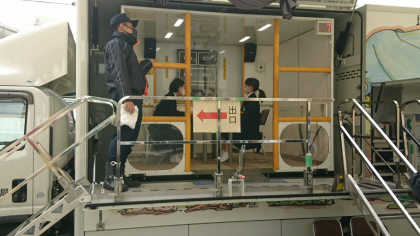 本日の5・6時間目、東成消防署・東成区役所・日本赤十字社・地域防災リーダーの方々にご協力いただき、避難訓練ならびに「防災教室」を行いました。写真は、1年生の「起震車」体験の様子です。