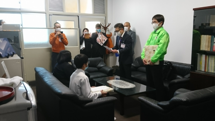 本日、大阪市青少年指導員連絡協議会主催の「絵画・写真コンクール」において、東成区青少年指導員連絡協議会会長賞と東成区長賞を受賞された1年生の表彰式を、会長様や区役所の方々にご来校いただき校長室で行いました。受賞おめでとうございます。
