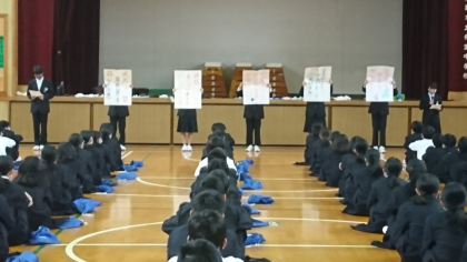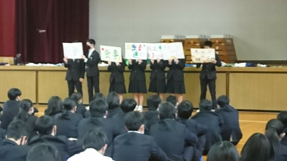 本日、終業式を明日に控え、全学年で学年集会を行い、担当教員から冬休み中の学習や生活の話、また保健委員の生徒たちが健康面について発表しました。保健委員の皆さん、ありがとうございました。生徒の皆さんには、規則正しい生活を心がけ、健康で安全な冬休みを過ごしてほしいと思います。