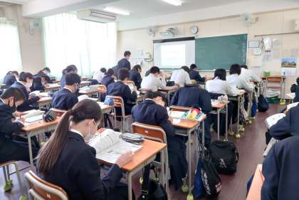 本日の授業風景です。上の写真から1年2組社会、2年2組英語、3年5組理科です。どの学級も集中して取り組んでいました。