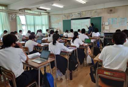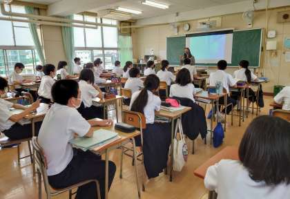本日の午前中の授業風景です。上の写真から1年1組英語(外国人英語指導員=CーNETによる授業)、2年2組美術、3年2組理科(化学変化とイオン、塩酸の電気分解の実験)です。午後からの授業も頑張りましょう。