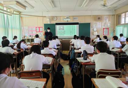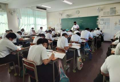 本日の1時間目の授業風景です。上の写真から1年2組美術(漢字一文字を選んでレタリングする)、2年1組国語、3年4組社会です。今日は、昨日よりも暑くなるようですが、今日も一日頑張りましょう。