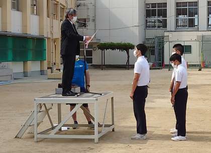 全校集会に先立ち、「大阪中学校総合体育大会」および「大阪市中学校春季総合体育大会」において、第3位に入賞されたラグビー部の賞状伝達を行いました。おめでとうございます。よく頑張りました!