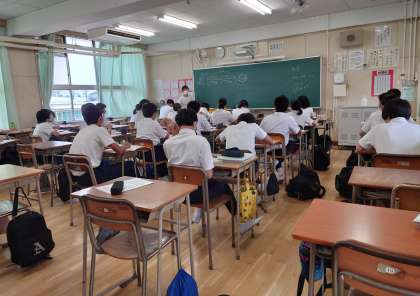 本日の授業風景です。上の写真から1年2組音楽、2年1組数学(少人数授業)、3年1・2組男子保健体育です。今日は、あいにくの雨模様ですが、生徒たちは頑張って授業を受けています。