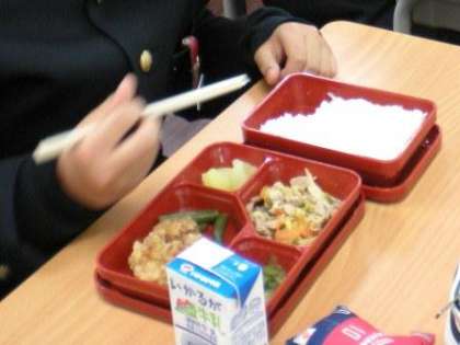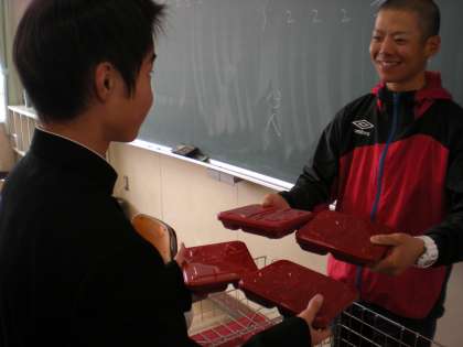 本校は本館校舎新築工事により、配膳室がないため、給食の実施が遅れていましたが、本館校舎内の配膳室が完備され、4月9日(木)より中学校給食が、始まりました。