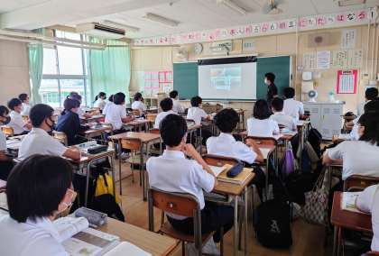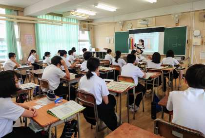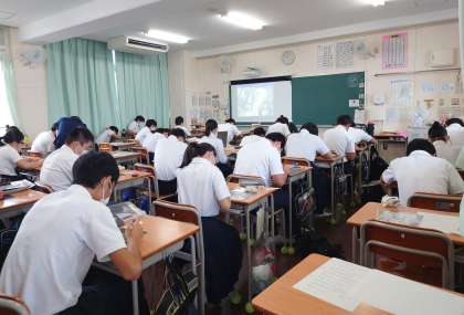 9月に入り、少し過ごしやすくなってきたように感じます。本日の2時間目の授業風景です。上の写真から1年2組家庭科、2年1組理科、3年1組美術です。