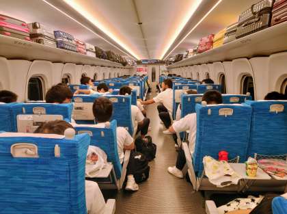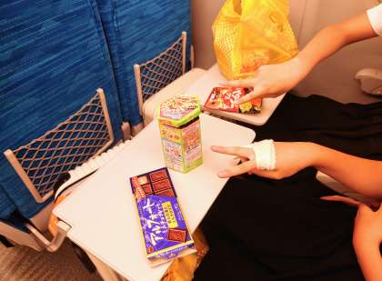 車内の様子です。お菓子を食べたり、トランプをしたり、和気あいあいと過ごしています。