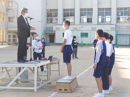 同じく全校集会の中で、「大阪中学校駅伝競走大会大阪市予選会」において、第7位に入賞された男子陸上部の生徒たちの表彰披露を行いました。おめでとうございます。よく頑張りました!
