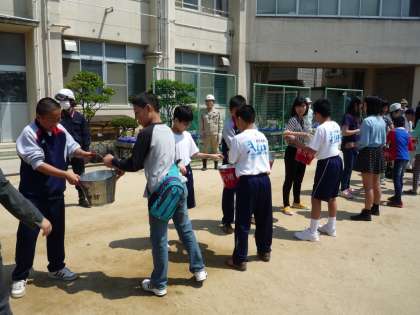 4月26日(日)に神路小学校で、神路防災訓練が行われました。相生中学校からも、生徒11名が地域の方と一緒に訓練を行いました。消火訓練・三角巾の使い方・バケツリレー・煙体験を行い、防災の心構えを学びました。一つ一つの体験が、有事の際に活用されることと思います。