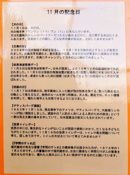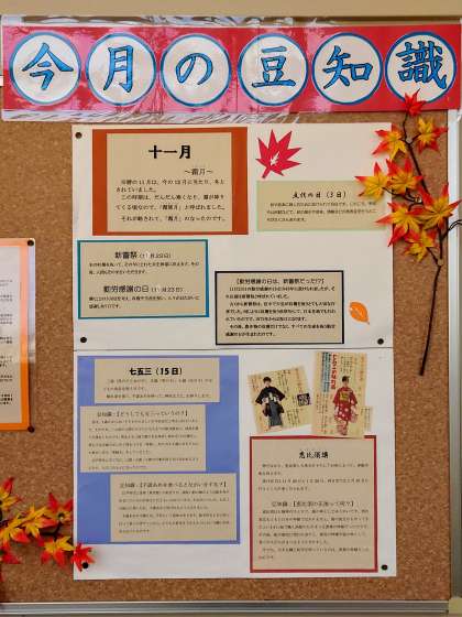 図書室前の掲示板です。図書館補助員の方が工夫を凝らして作成された「今月の豆知識」が掲示されています。10月27日〜11月9日は読書週間です。たくさんの本に親しみ、読書習慣を身につけましょう。