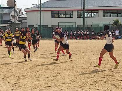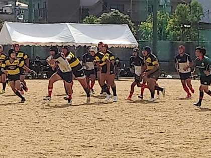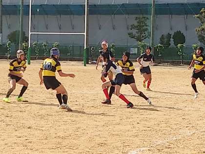 手に汗を握る緊迫した試合展開が続きましたが、その中で1トライを奪い返します。その後、終了間際の自陣ゴール前でのピンチを粘り強いディフェンスでしのぎ、12ー7で勝利しました!